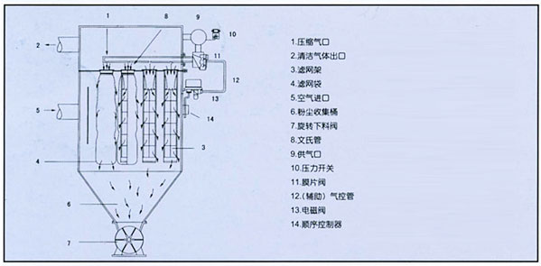 含塵氣體由進(jìn)氣口進(jìn)入灰斗(沒有灰斗的將直接進(jìn)入袋室),然后經(jīng)由灰斗進(jìn)入裝有濾袋的過濾室。粉塵附在濾袋的外表面,凈化后的氣體油濾袋進(jìn)入上部箱體,再經(jīng)排風(fēng)管道,由風(fēng)機(jī)排到大氣
