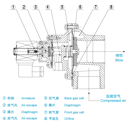 脈沖噴吹控制儀的電信號使電磁脈沖閥銜鐵后移,閥后氣室放氣孔打開,后氣室迅速失壓,膜片組件后移,壓縮空氣通過閥輸出口噴吹,電磁脈沖閥處于“開啟”狀態。